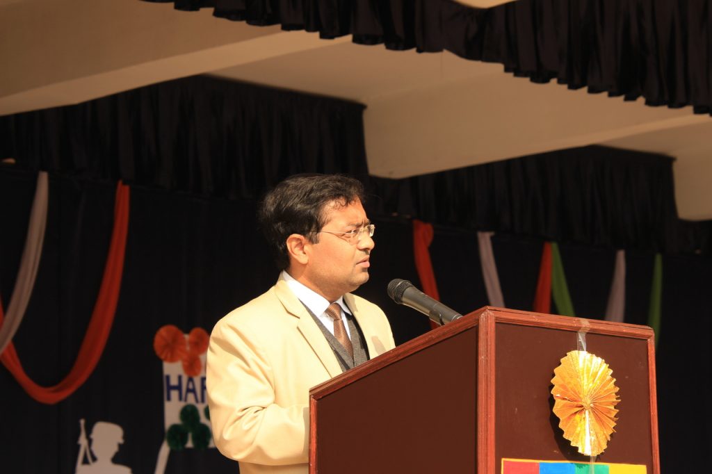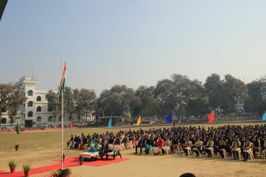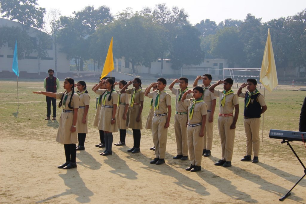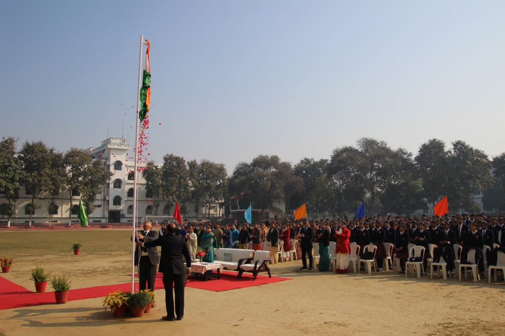 The program started at 9:30 am, with the flag-hoisting by our Director, Mr C.V. Innes, followed by the National Anthem. National Anthem was followed by the Scouts and Guides salute. Head Boy, Saksham Rastogi gave the speech in English and Aman Kesarwani gave the speech in Hindi.
