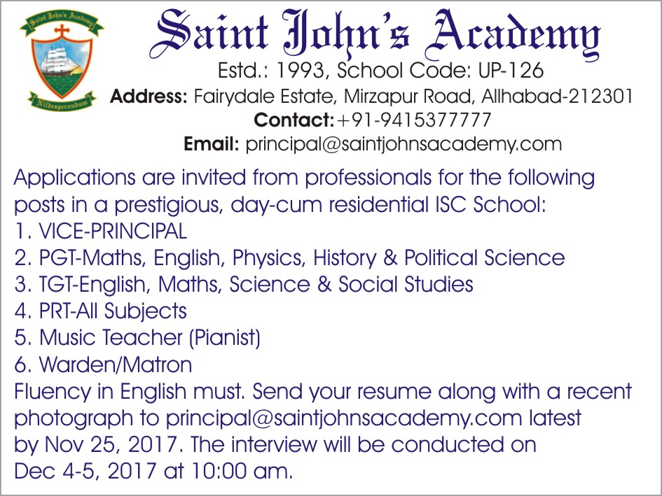 Fluency in English must. Send your resume along with a recent photograph to principal@test.saintjohnsacademy.com latest by Nov 25, 2017. The interview will be conducted on Dec 4-5, 2017 at 10:00 am.
